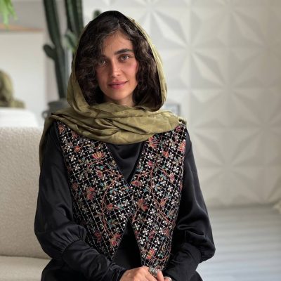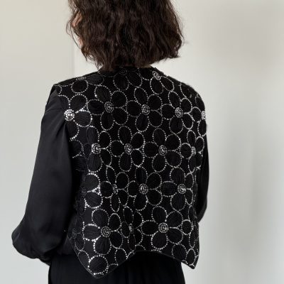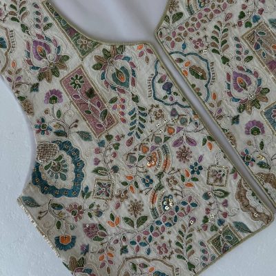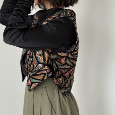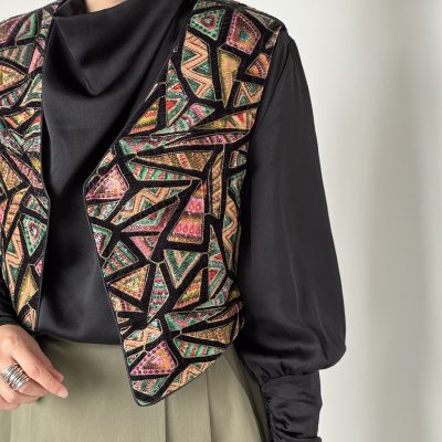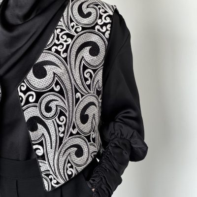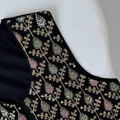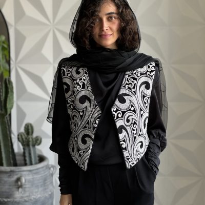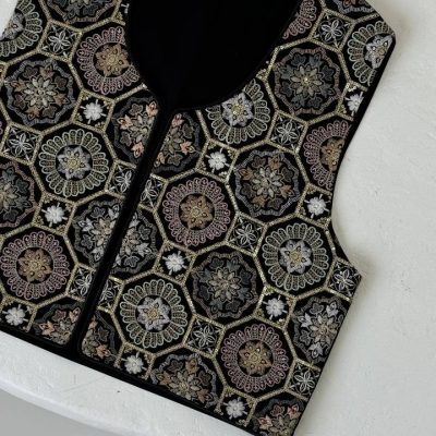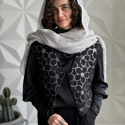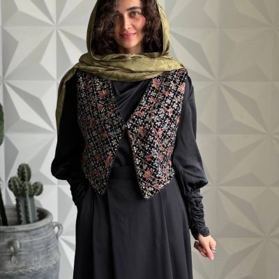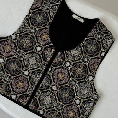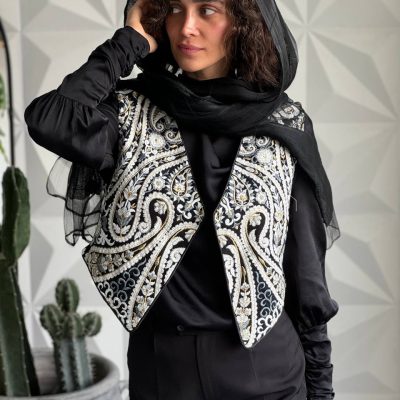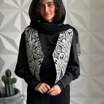 ترمه دوزی قسمت جلو و پشت جلیقه از کالکشن پروانه ؛ از بیس ترمه میباشد. دور سینه ۱۰۵ قد ۵۰