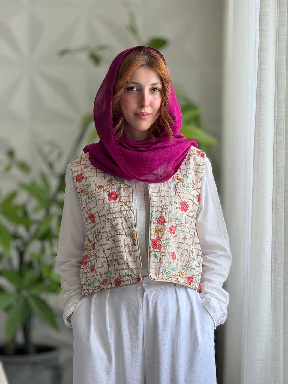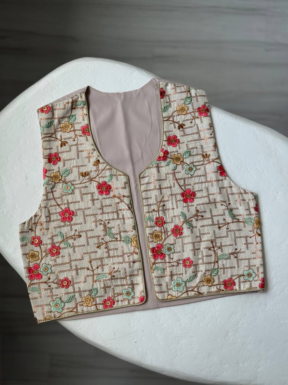 | توضیحات | پشت جلیقه کتان کرم کار شده است.جلیقه آسترکشی شده است و رنگ آستر کرم است. |