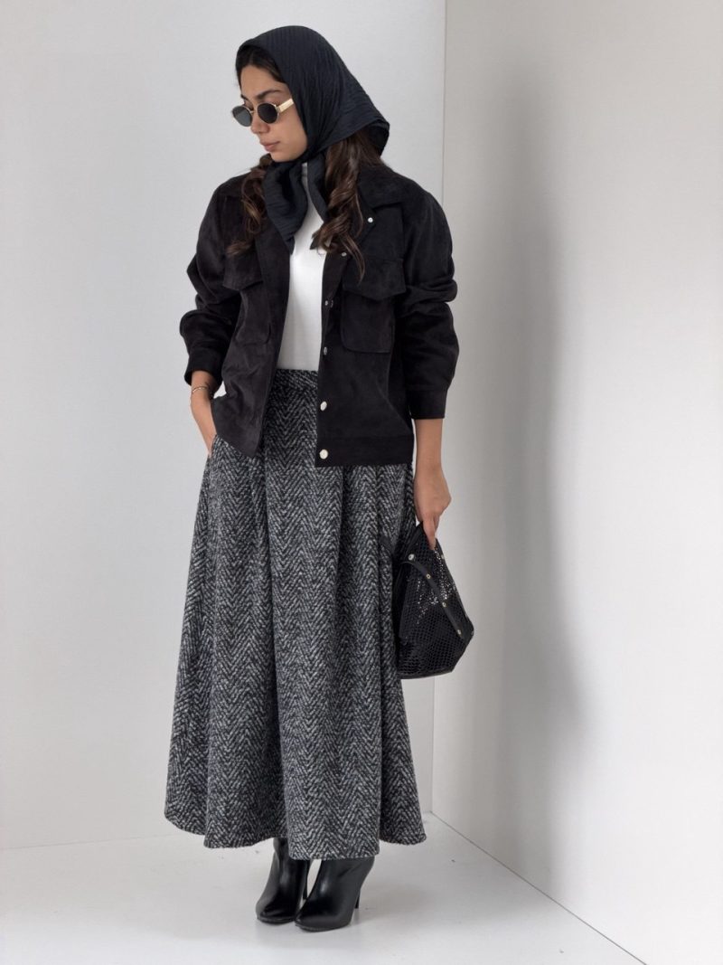 جنس دامن فوتر درجه یک ترک است. دامن چهار پیلی دارد دامن جیب دارد قد دامن 90 دور کمر دامن در حالت عادی 65 و در حالت کشسانی96 است.